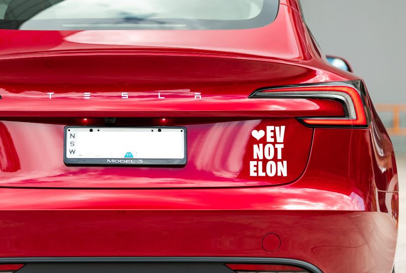 Love your Tesla or other Electric vehicle (EVs) but not a fan of the eccentric man behind the wheel of the company? Well this sticker is for you.