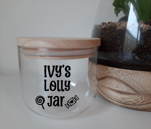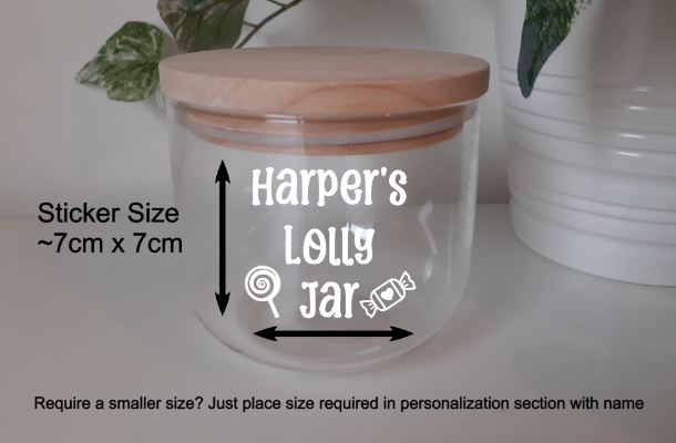 Kids love their sweets and lollies. Make them feel special with their own (DIY) personalised jar. Just let us know the child's name and you'll receive a personalised sticker that can be applied to any smooth container or jar. For example if you write "Tom", the sticker will read "Tom's lolly jar") . If you would prefer the wording "Sweet Jar" or similar ather than lolly jar, please place this in the message or notes section.